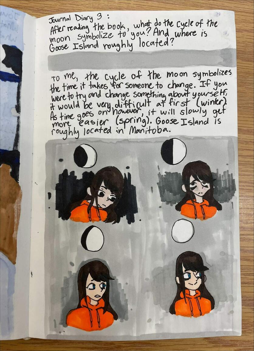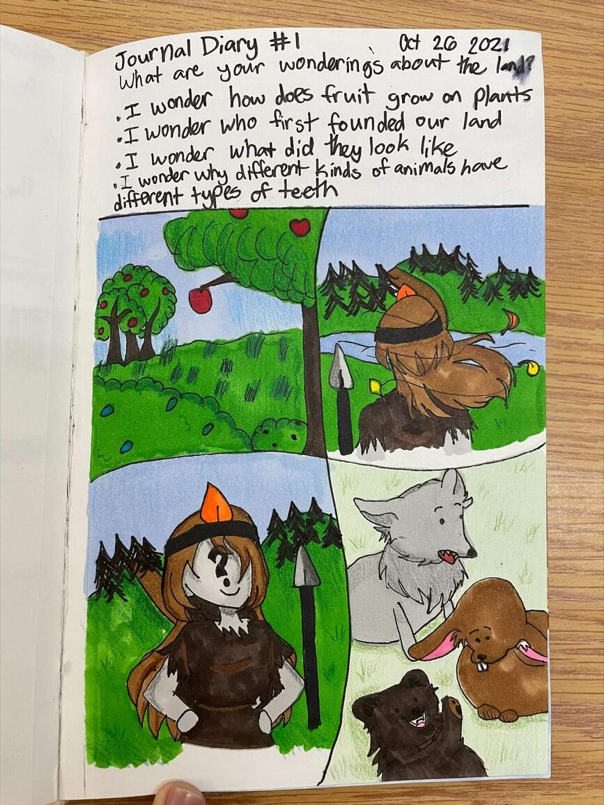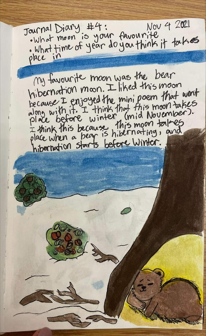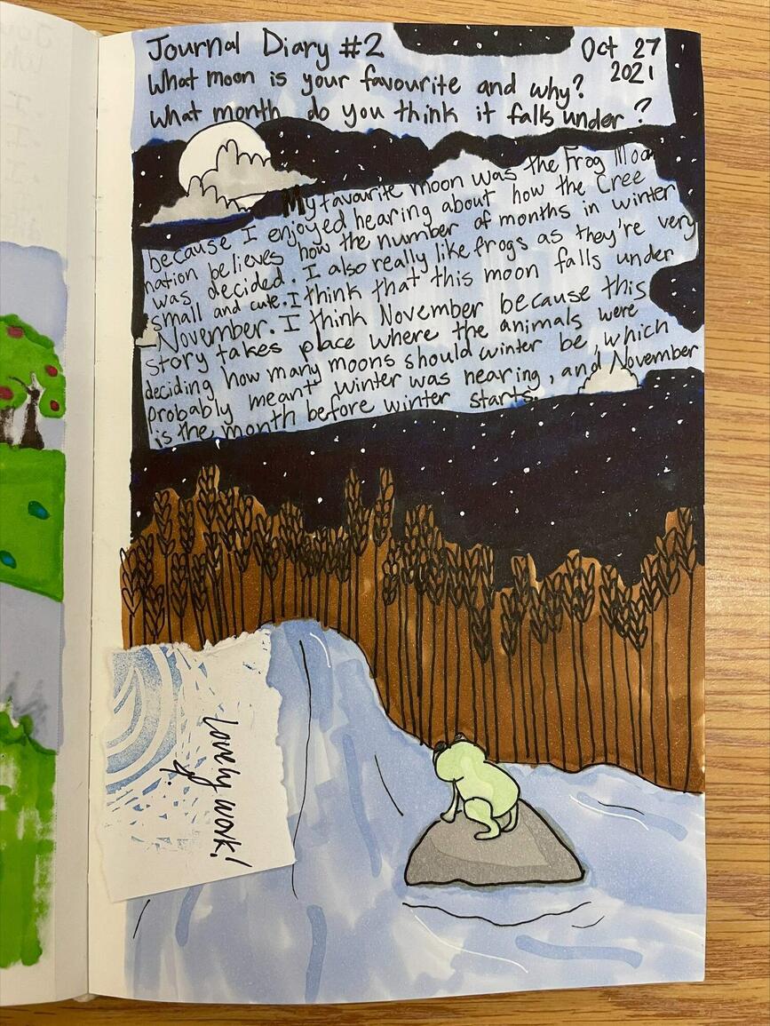 In Ms. Roberts’ class students were incorporating Indigenous Knowledge and First Peoples’ Principles of Learning with a collaboration of Allison Gardner, District Teacher of Indigenous Success (Supporting Indigenous Pedagogy). While studying 13 Moons in her classroom, students were asked to demonstrate their understanding of Indigenous Knowledge using a creative point of view. The result is a stunning set of artistic pieces created by the students which tells the story of the 13 Moons. Plans are in place to create a 2022 Calendar based on the results. Nice work Ms. Gardner, Ms. Roberts and Mouat students.