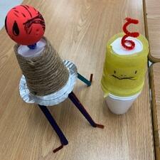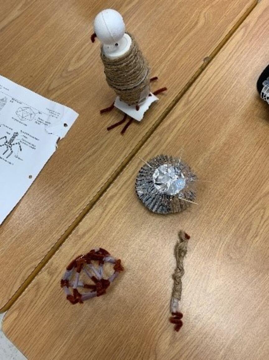 4 types of viruses made out of a random box of supplies. For this activity, even reluctant learners participated and the result was a more memorable lesson and relaxing teaching experience. After the models were assembled, I roamed the room and asked each student to verbally name the parts and functions represented in their structure as an on the spot assessment for learning. Any errors or omissions in the student’s understanding were quickly corrected by our conversation and I knew if they were ready to move on to the next topic.