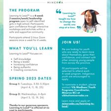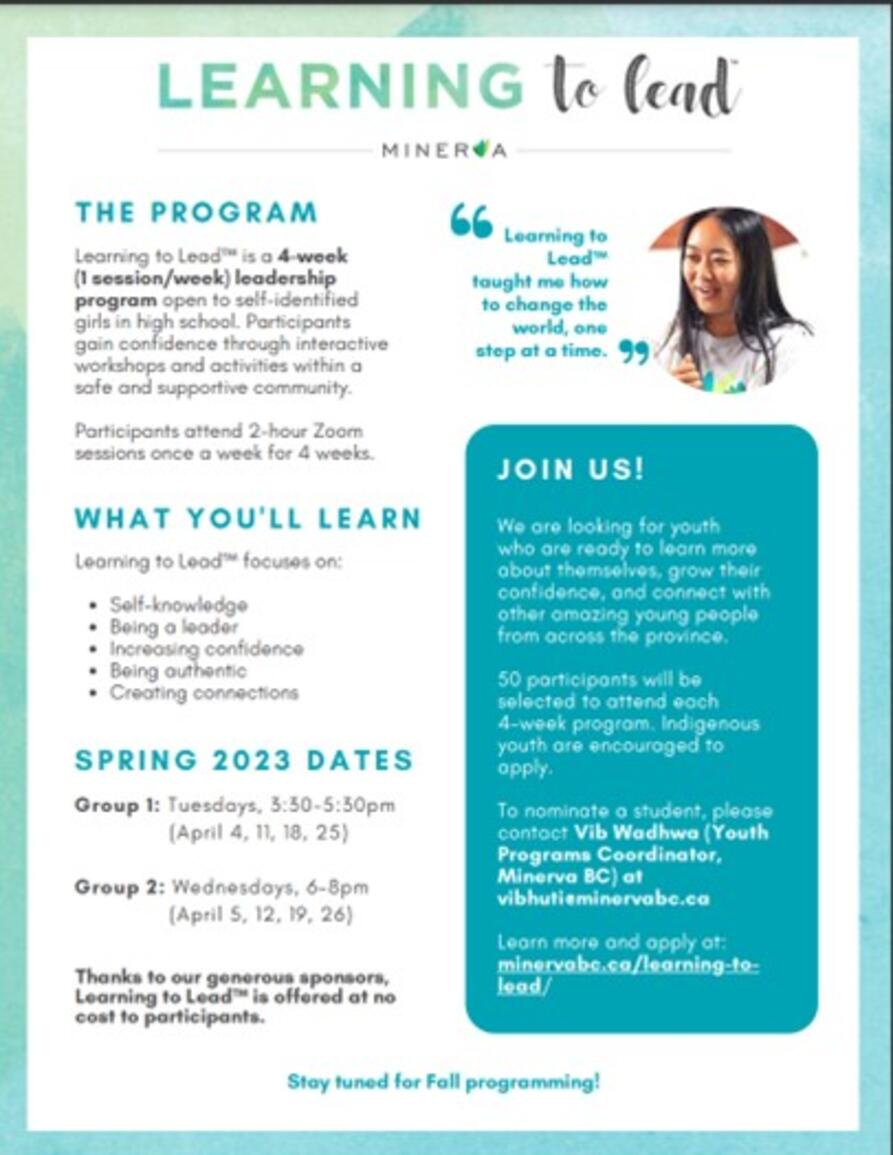 Minerva BC is now accepting applications for the Spring 2023 cohort of Learning to LeadTM! This program is a unique opportunity for self-identified girls in Grades 10 – 12 to increase their confidence and realize their leadership potential while creating a network who will support them along their educational and career journeys.