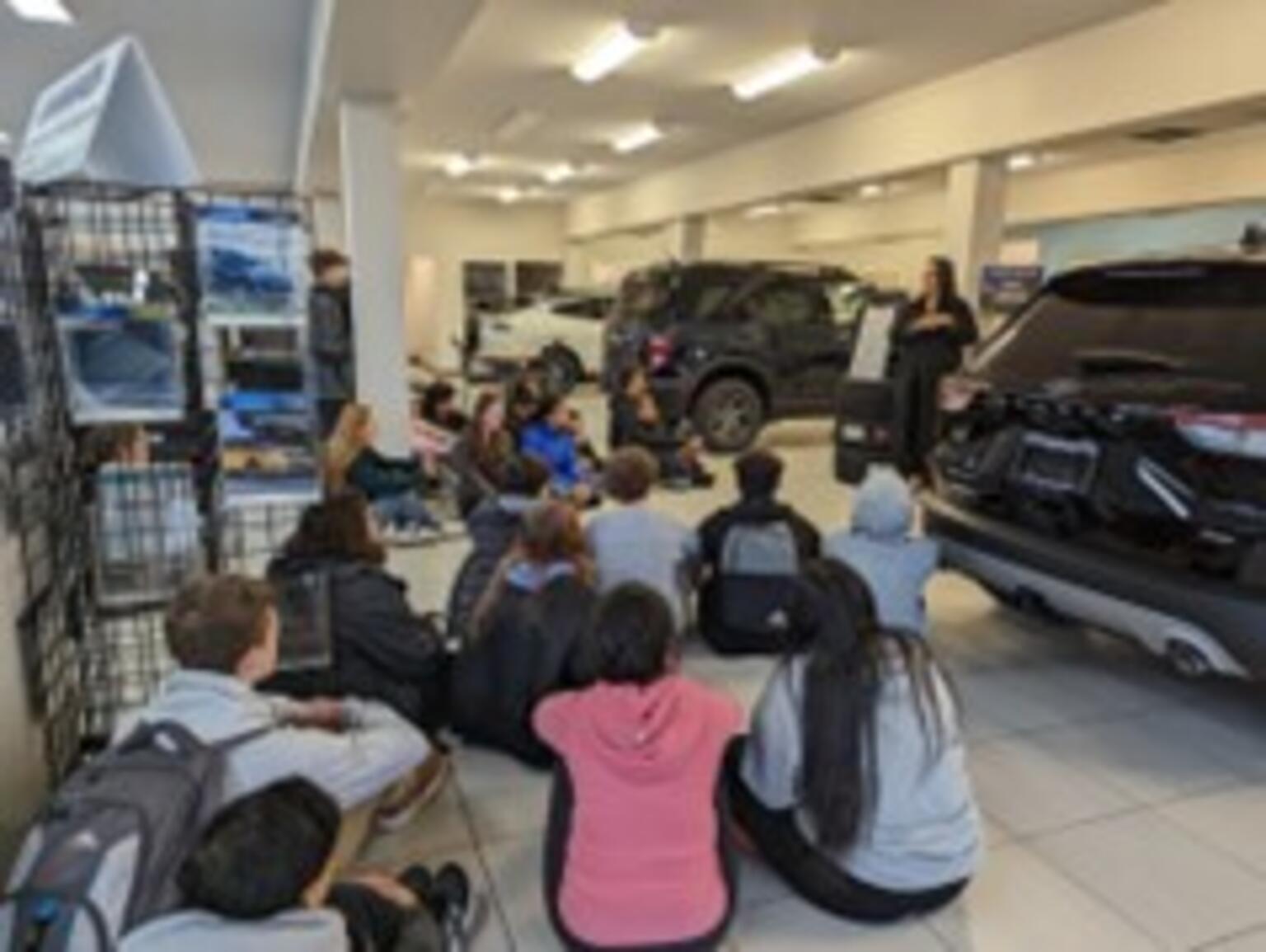 During this Deeper Learning time, math 9 students took a field trip as part of their Finance unit. They had an opportunity to sticker shop in the lot at Magnuson Ford before heading into the sales floor where Celia, the Financial Service Manager, and John, a Sales and Lease Representative, walked them through the math of buying a car. Students learned what they need to qualify for financing or leasing of a vehicle. Credit scores and the debt-to-income ratio were clearly explained and perhaps had a few students rethinking their choice of the $95,000 Mustang Mach-E that initially caught their attention. Layne Magnuson took the time to stop by and meet the students and commented that he wished he had the opportunity to do something similar when he was in school. Thank you, Magnuson Ford, for welcoming our grade nines!