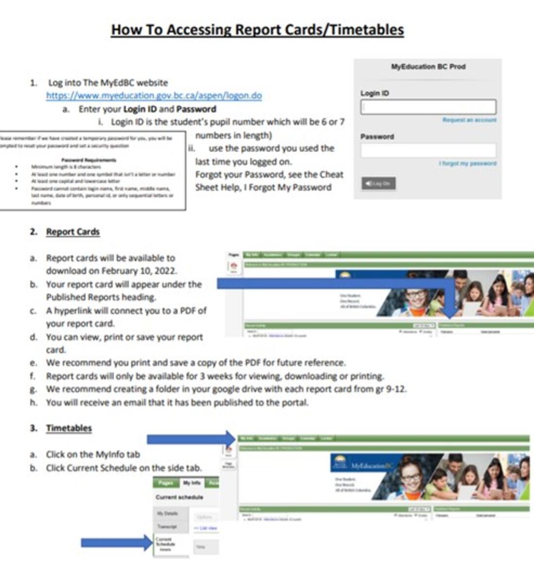 On Monday, we will begin Semester 2. All students were sent via their learn34 account a reminder to check their myed account for their updated Semester 2 timetable (see graphic for help). We will NOT be printing timetables. If you are having trouble logging in see Ms. Mangat in the LC, a counsellor, or admin for support to reset your password (we also sent directions to student’s learn34).