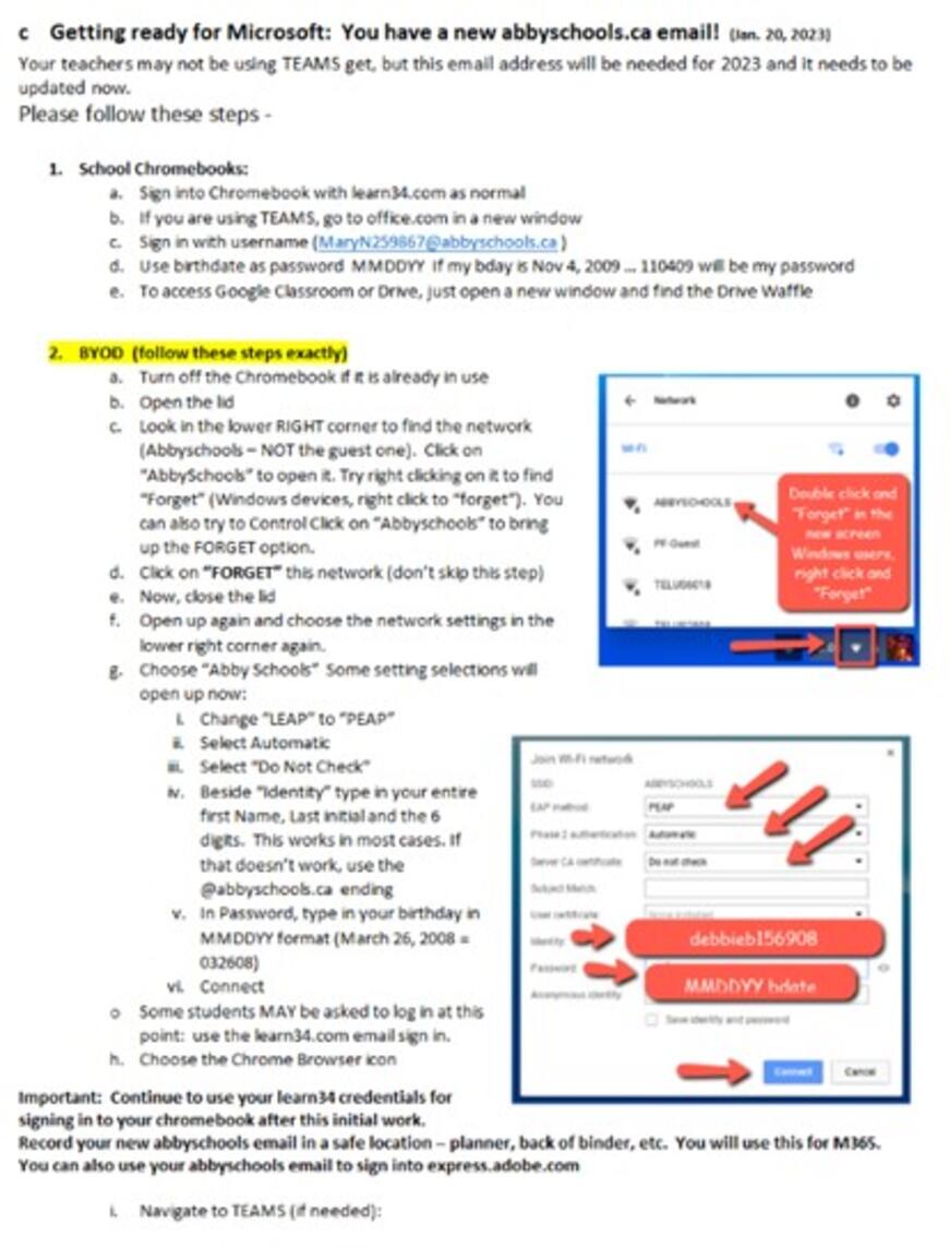 As of Tuesday, Feb. 7 students will be issued a NEW Microsoft email address – so check your learn34 email for your NEW credentials. These new credentials will be used to log into any school district device AND the students BYOD devices. On Tuesday, students with BYOD devices will need to forget the network and relaunch their computer. Tech support will be available in the Library all day so bring your devices to school on Tuesday. See specific instructions below: