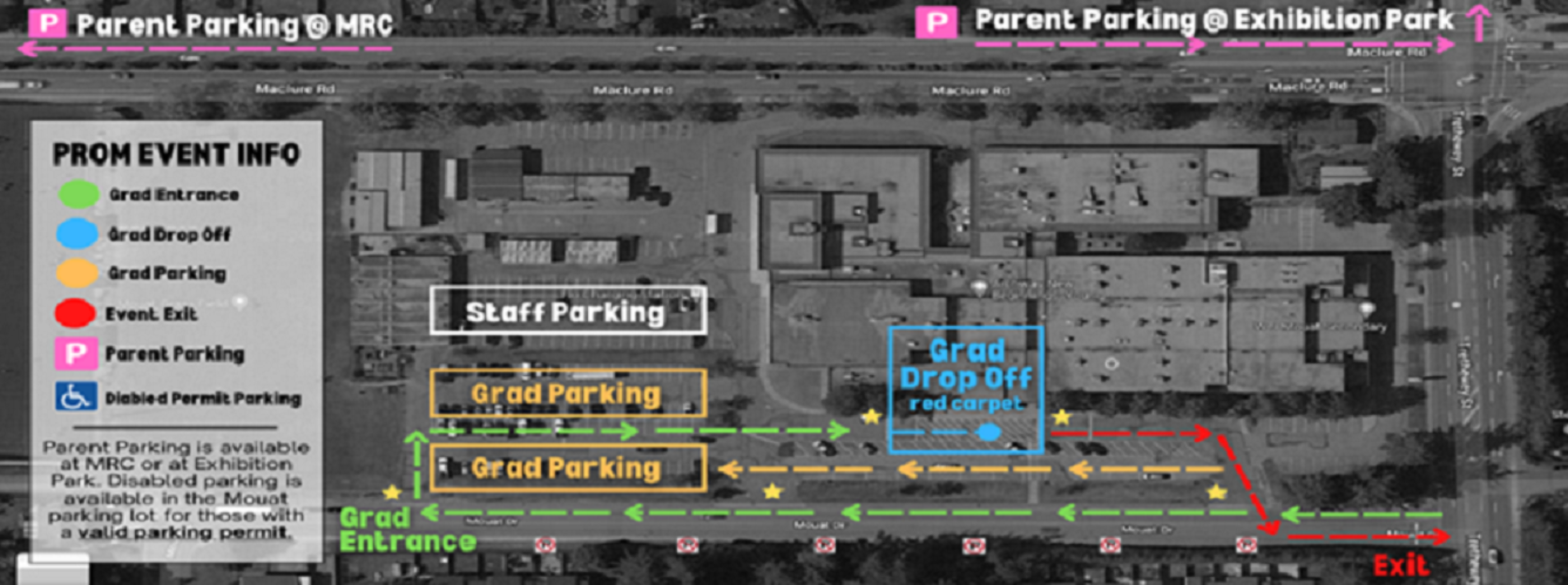 Student will arrive at Mouat anytime between 3pm and 4pm. They will drive west along Mouat Drive to the far entrance of the parking lot (follow the green line in the picture). Once within the parking lot, they will travel east to the red carpet drop off site. Graduates and their guest will walk the red carpet with lots of opportunity for pictures. Their driver will either loop back to park the vehicle within the student parking area (following the orange arrows) OR exit the site (following the red arrows). SEE DIAGRAM BELOW